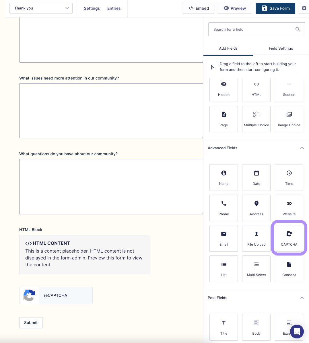 Para añadir el bloque de campo Captcha, ve a Campos avanzados y arrastra y suelta el CAPTCHA antes del botón de Enviar en tu formulario.