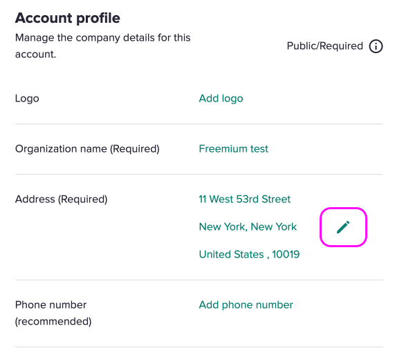 3. En las opciones de Perfil, haz clic en el icono del Lápiz que se encuentra a la derecha de Dirección (Obligatorio).