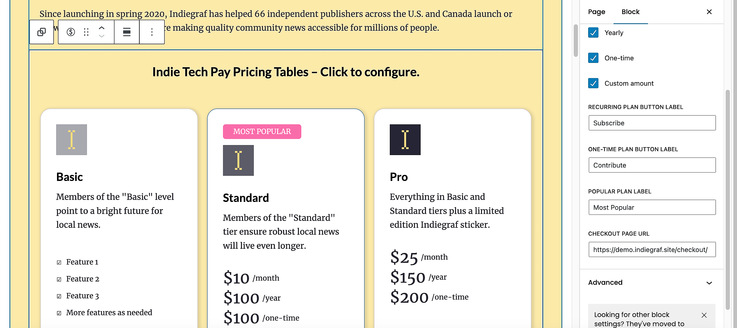 Busca “Indie Tech Pay Pricing Tables” al agregar un bloque.