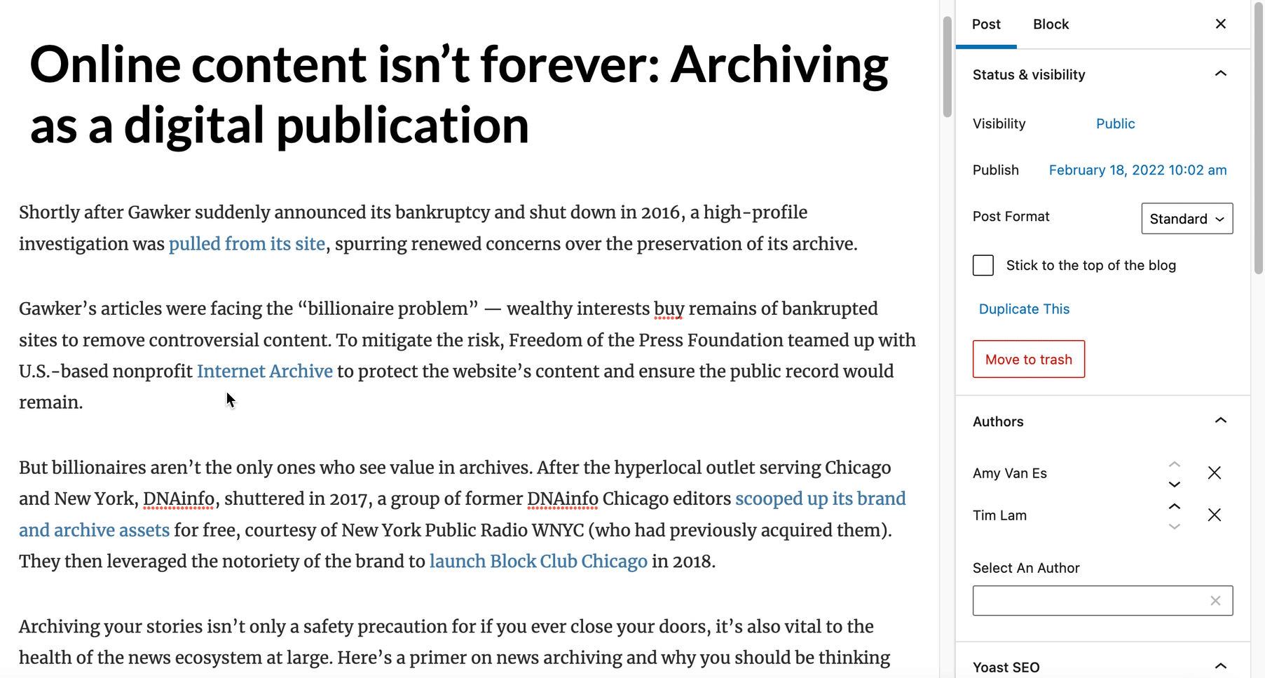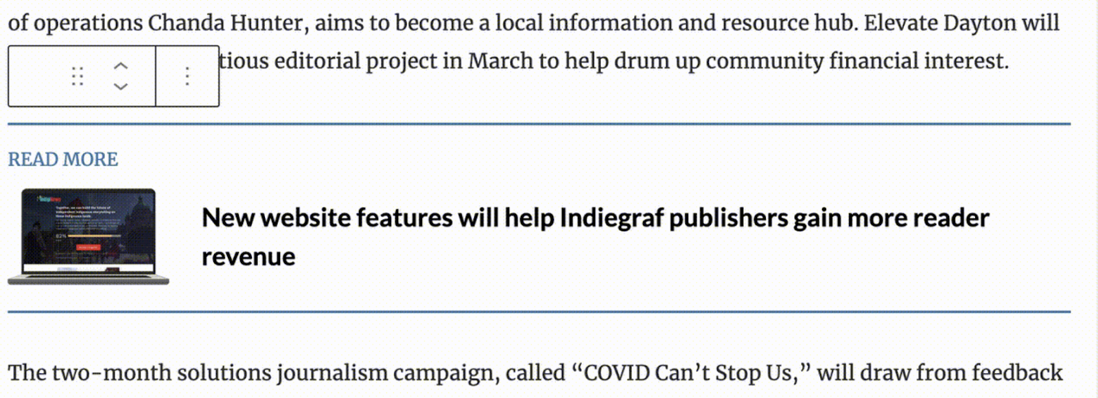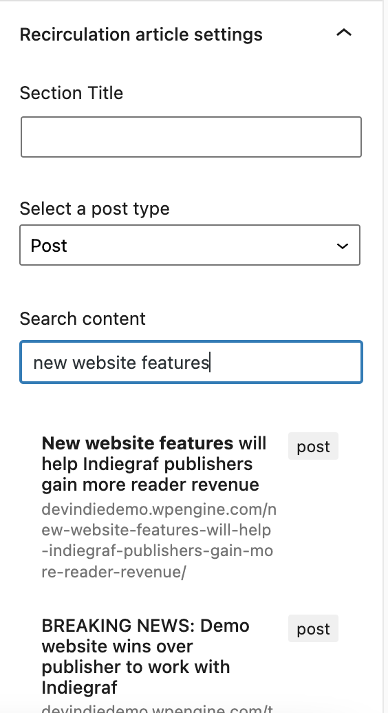 El bloque de recirculación te permite añadir un artículo relacionado en cualquier punto de tu publicación. Después de añadir el bloque, puedes buscar qué artículo se mostrará en la barra lateral: