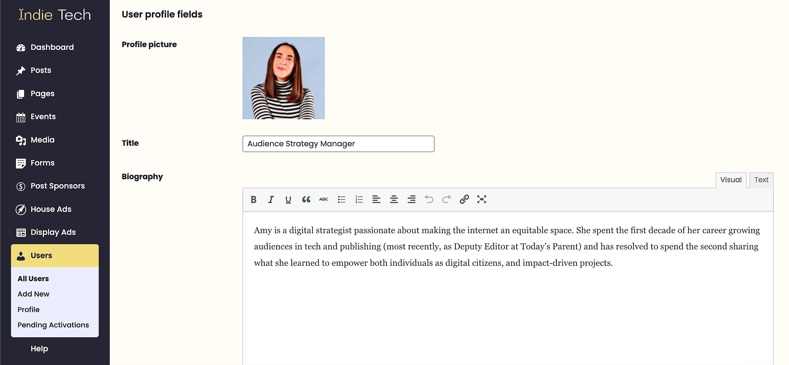 El Bloque de Lista de Usuarios obtiene los datos de los campos del perfil de usuario, en la sección de Usuarios. Si el usuario tiene una foto de perfil y una biografía, estas aparecerán en el bloque, al igual que cualquier información de redes sociales.