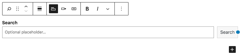 El bloque de búsqueda te permite mostrar un campo de búsqueda y un botón. El texto predeterminado del botón es “Buscar”, pero puedes cambiarlo simplemente haciendo clic en el texto y escribiendo el texto de reemplazo que desees. Puedes cambiar el texto de marcador de posición predeterminado (el texto que aparece dentro del campo de búsqueda cuando está vacío) utilizando el mismo método.