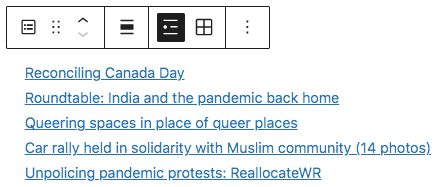 El bloque de publicaciones recientes te permite mostrar una lista de las publicaciones más nuevas de tu sitio. Puedes mostrar las publicaciones en Vista de lista o Vista de cuadrícula utilizando los iconos de la barra de herramientas del bloque.