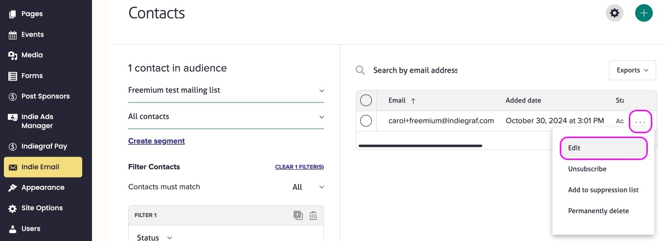 4. You will find these attributes in the contacts list and its subscription form that will be generated after adding them. Click on the ... and Edit next to a contact to link the customer with an attribute.