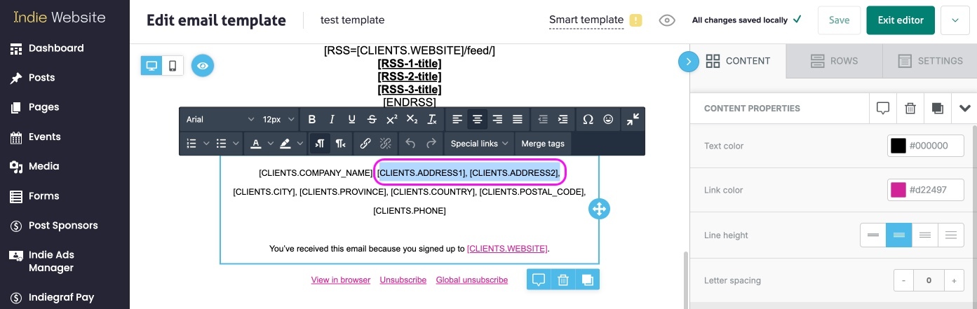 3. Type [CLIENTS.ADDRESS] where you want your physical address to appear and personalize it with text color, size, etc.