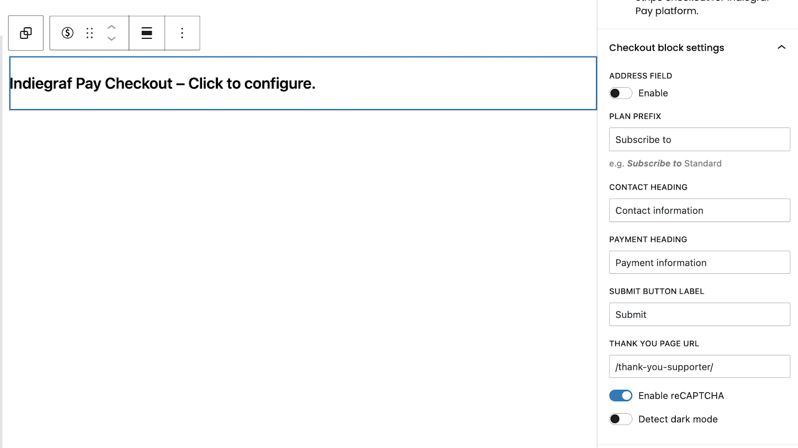 On the /checkout page, configure the Indiegraf Pay Checkout block.