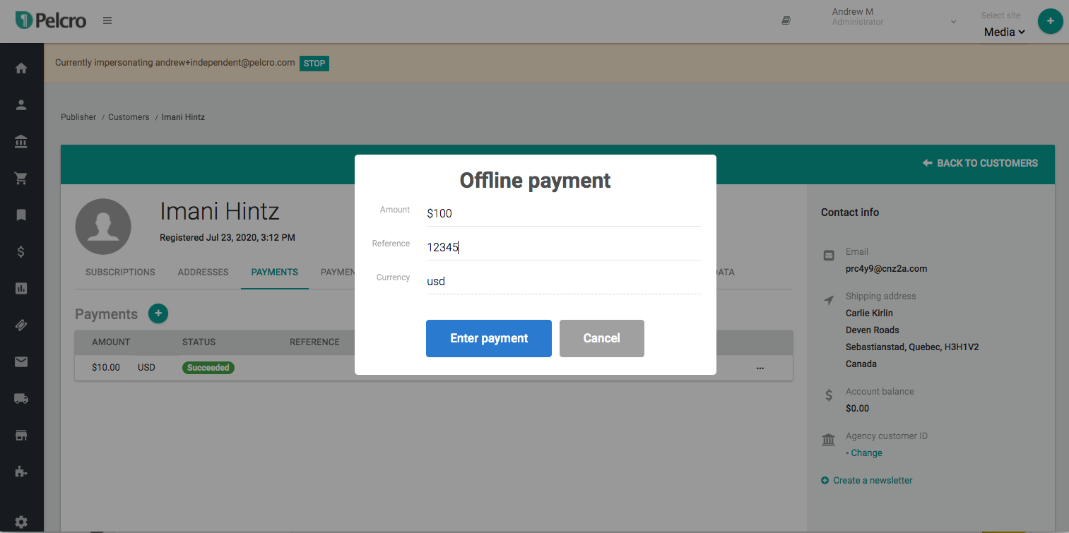 This is useful when you have customers that pay outside Pelcro. You create a customer and set the payment as Offline. Offline payments made by customers credit the customer's balance. As you can see in the image below, an offline payment of $100 created a negative customer balance on the customer's account. Offline payments can be used when a customer pays in cash, check or any other form of payment that will not be recorded via the platform.