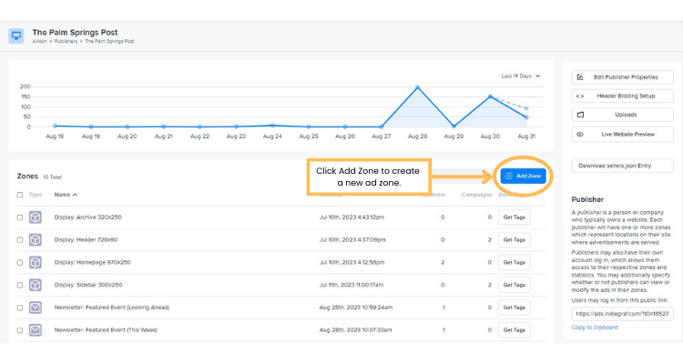 Click Create Zone to save the new email ad zone. It will appear in the table of zones in the publisher's section.