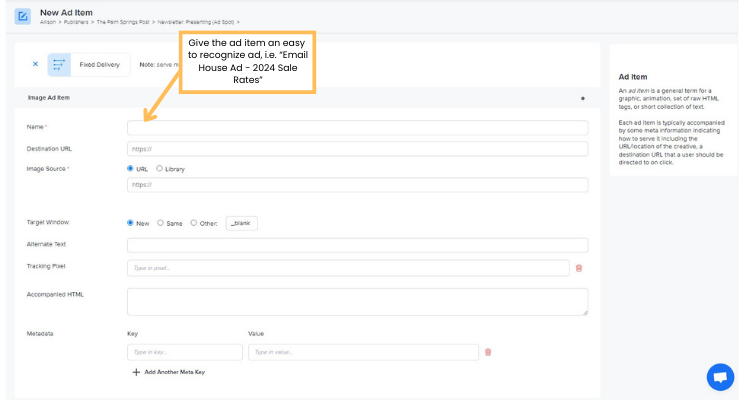 Give the ad item a name. Fill in the rest of the fields as needed.
