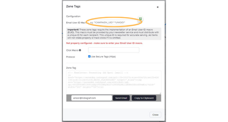 For ad items to rotate and track clicks properly, email ad zone tags require an Email User ID macro (EUID). Email providers have different implementations for the EUID. See Common Newsletter Email Unique IDs for a list of EUIDs from major email providers. If your provider's EUID isn't on the list, contact our support team at [email protected] for help. Additionally, you can refer to helpful resources for detailed guidance, such as "Serving Ads to Your Email Platform Using Indie Ads Manager" and "Indie Ads Manager - First Image Ad".