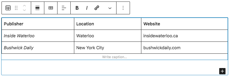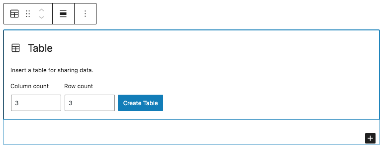 The table block allows you to create an HTML table. When you add a table block, you will be prompted to specify the number of rows and columns you want to have in your table. To add or remove columns afterwards, you can use the options available under the Edit Table icon in the block toolbar.