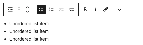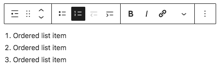 The list block allows you to create ordered (numbered) and unordered (non-numbered, typically bullet point) lists. You can switch between these two list types by clicking their icons in the block toolbar.