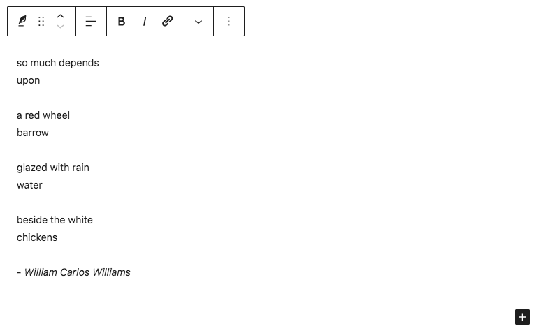 The verse block allows you to add text that uses special spacing formats, such as poetry or song lyrics. Unlike a paragraph block, the verse block will maintain your spacing and tabs.