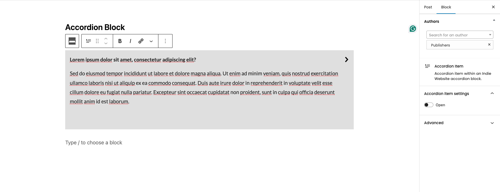 The accordion block allows you to add content to a collapsible section. The title of the accordion block will display, but the text can be revealed when the accordion is expanded. It is a great way to improve page navigation if you need to share large amounts of text. Some publications will use this block when creating a frequently asked questions section.