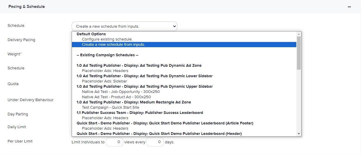 Under the Pacing & Schedule section, select Create a new schedule from inputs from the Schedule dropdown.